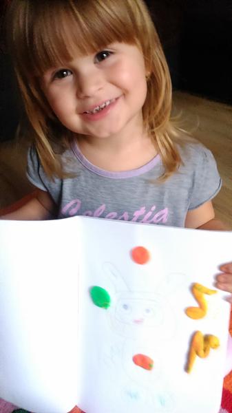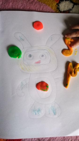 Nikolce malování ještě moc nejde, tak jsme do toho zakomponovaly něco, co u nás teď frčí a to je modelína 🙂 vyfotit malou,aby to nebylo rozmazané byl nadlidský výkon, pořád se vrtí 😀
