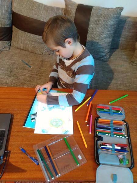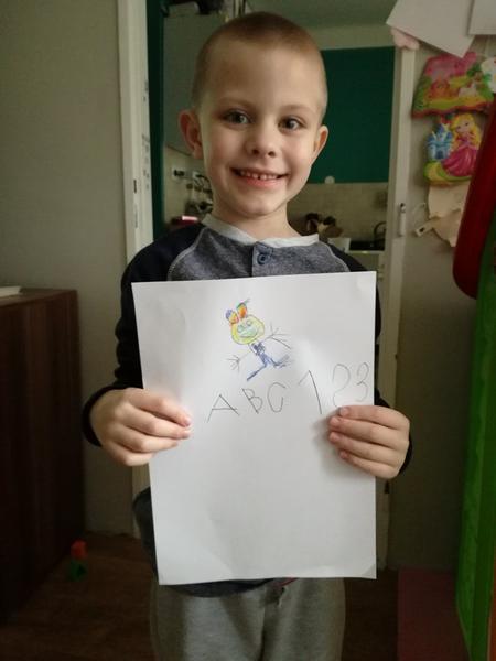 Páťa musí mít na kreslení svoji náladu. Snažil se, hračka se mu líbí, proto maloval a psal 🙂