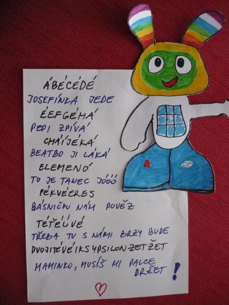 Milá Míšo, omlouvam se za obrázek takový,jaký je. Bohužel si v patek Radka zapomněla pastelky ve škole,ale byla tak nešťastná,ze jej vymalovala aspoň zvyraznovacem. Basnicka dole zní: