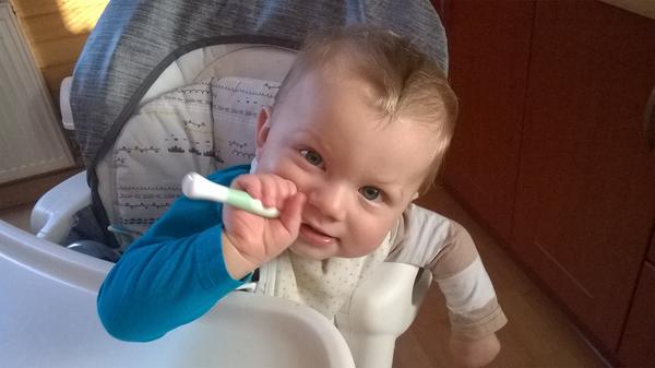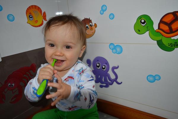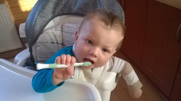 U nás ranní a večerní hygiena vypadá takto. Zatím čistíme jen 4 minizuby, protože se vyklubaly teprve nedávno, těsně před 1.rokem, ale nic se nesmí zanedbat 🙂