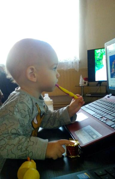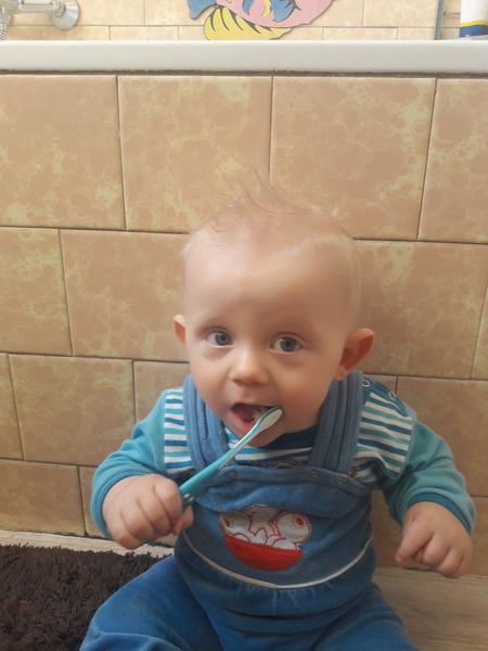 Lukajda si čistí svoje dva zoubky velmi důkladně😉. A těch pár chloupků na hlavičce také načísneme😀