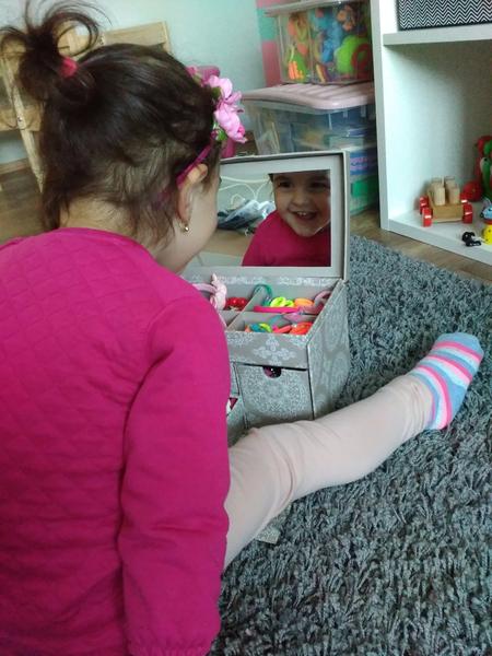 Stejně tak prohlížení se v zrcadle a prohrabávání se v gumičkách, sponkách a čelenkách. Máme doma malou paradnici 🙂
