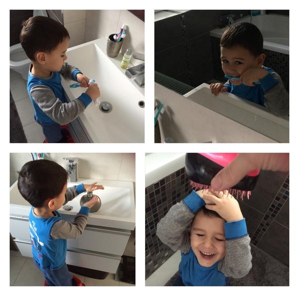 Jelikož je akorat syn nemocny, od rana lezime u pohádek na gauči, tak tato soutěž nas konecne dokopala k tomu, abychom vstali a šli ranní hygienu vykonat. Syn vse děla rad sam, včetně naopak oblečeného pyžamka co ma akorat na sobě na fotce :D jen teda učesat se nechtěl 😃