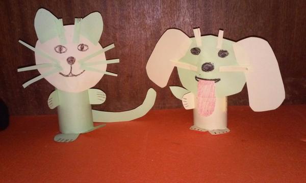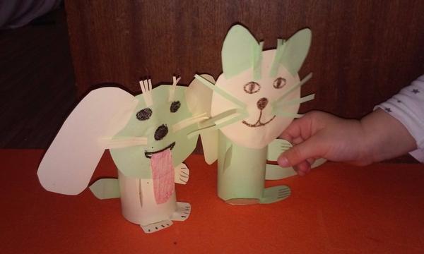 Starší dcera má spoustu zvířecích kamarádů, především plyšových. Z živých zvířátek má ráda kočičky (asi po mamince🙂) Občas volá z balkonu na sousedovic kočky "mňaaam",jak kdyby měla hlad🙂. Tak jsme vzaly do ruky oblíbené miky a lipíbo (v překladu nůžky a lepidlo) a vytvořily kočičku. Aby jí nebylo smutno,tak přibyl i pejsek, pro malou ségru🙂.