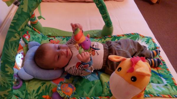 Od nás má malý pouze plyšové hračky aktuálně od holek nafasoval růžové prase, bož můj, ale udajně má krásnou srst a ladí mu 🙂).