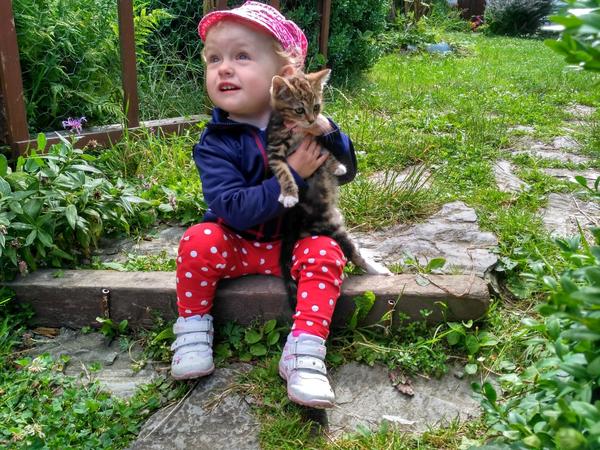 U nás zatím vedou kočičky u babičky, má celkem 3 a dvera je ráda prohání a chystá jim granule a jiné dobroty..🙂 Na fotce se dcera poprvé setkala s koťátky a byla unešená z toho, že si je může chovat a jsou tak hravé..🙂