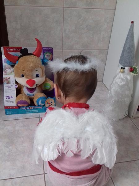 Je pro nás jako stvořená také díky tomu, že se konečně můžeme naplno zapojit i s tak malým prckem s dílem, které trvalo rozhodně déle než půl hodiny. Kostým, který má na sobě syn jsem sama šila (jsem amatérka a docela mi to trvalo), ale jsem z čertovské vestičky, která má na sobě ocásek nadšená. Čertíka máme, už nebylo těžké sehnat do party anděla (maminku) a mikuláše (našeho již zmíněného kamaráda pejska). jen moje nadšení nesdílel syn a moc se nechtěl fotit. Mějte se krásně a užívejte vánoční pohodu.