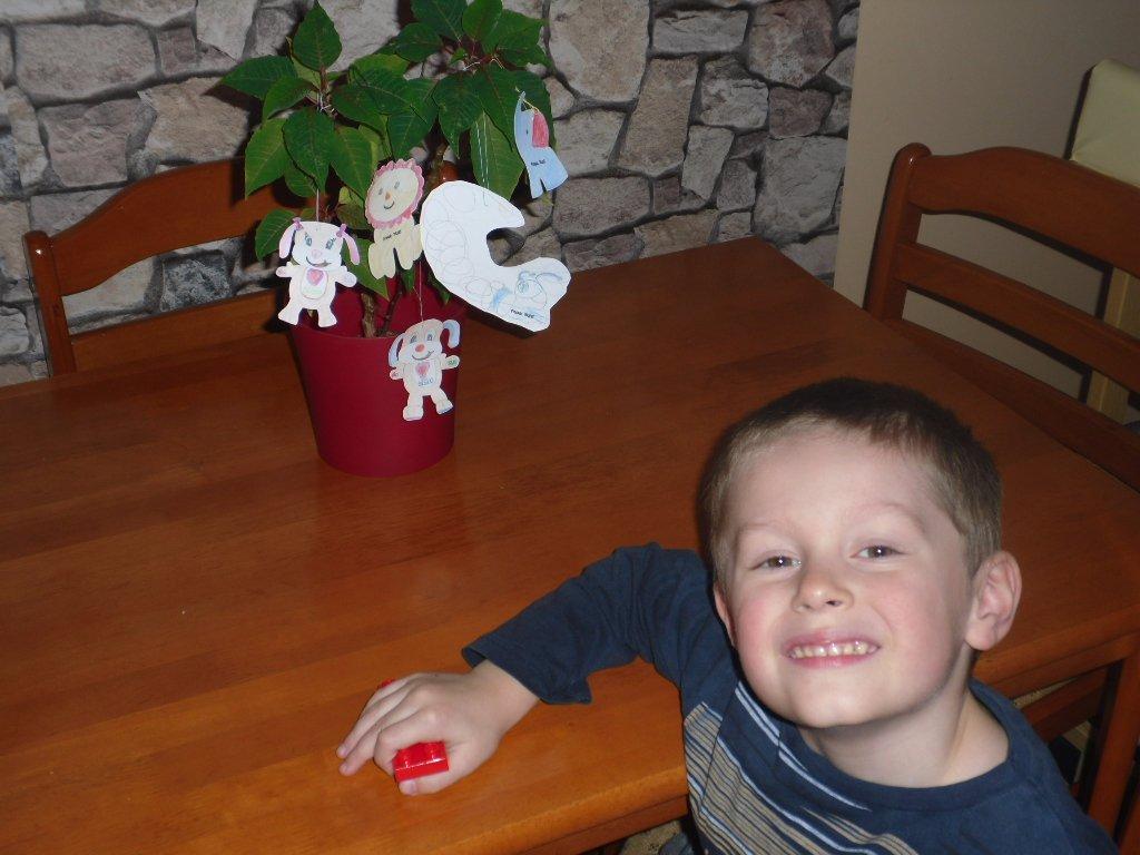 Jelikož jsme opět nemocní a musíme být doma, tak jsme to vymysleli takto. Nazdobili jsme jednu z pokojových květin, které nám zdobí okno. Můj malý pomocníček Jaroušek přihlížel a poslední housenku si namaloval s mojí pomocí sám a velice se mu povedla.