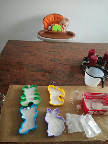 Dobrý večer. Míšo, opět moc děkuji za úkol - pro nás to byla mega zábava a hlavně už vím, čím ozdobím stromeček. Úkol to byl nelehký, ale syn mi ráno povídá - namalujeme ty postavičky barvami na okno a Nika vykrojí ze slupky zvířata.. no a já sem si ještě vymyslela tvrdnoucí hmotu... jenže všude byla ta co tvrdne dva dny na suchu. Strýček google po delším hledání našel hmotu do trouby :D jen mouka sůl a voda 🙂 Takže abych maximálně zapojila obě děti - Nika připravovala těsto, válela, vykrajovala a razítkovala...