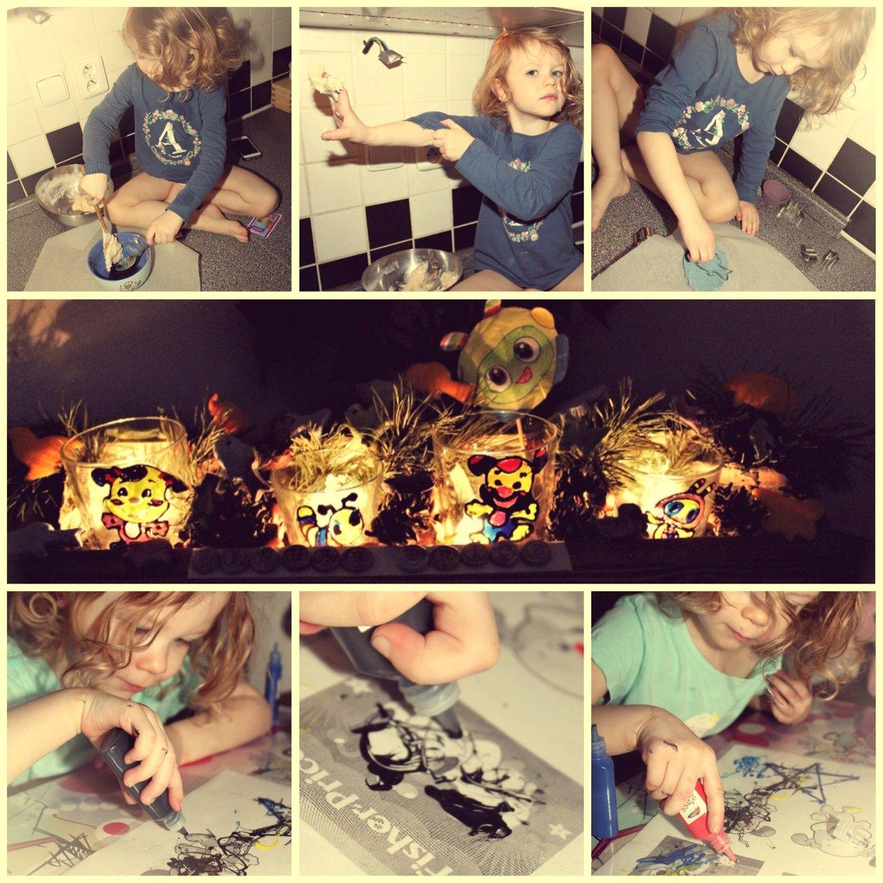 Píťa ten měl za úkol najít ty postavičky, a barvami je udělat na folii... čerpáme z toho, co máme doma, takže barvy nejsou FP, ale snad snaha se taky cení. Při celém tomhle tvoření jsme si řekli, že to uděláme na náš DIY svícen, zašli jsme do lesa na větvičky (krásně padal sníh) posbírali jsme zbytek šišek co jsme našli a pak šup domů.