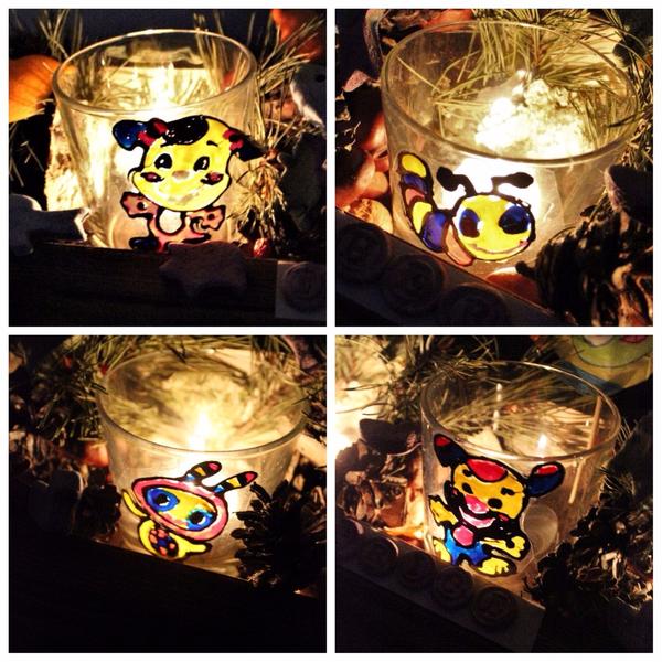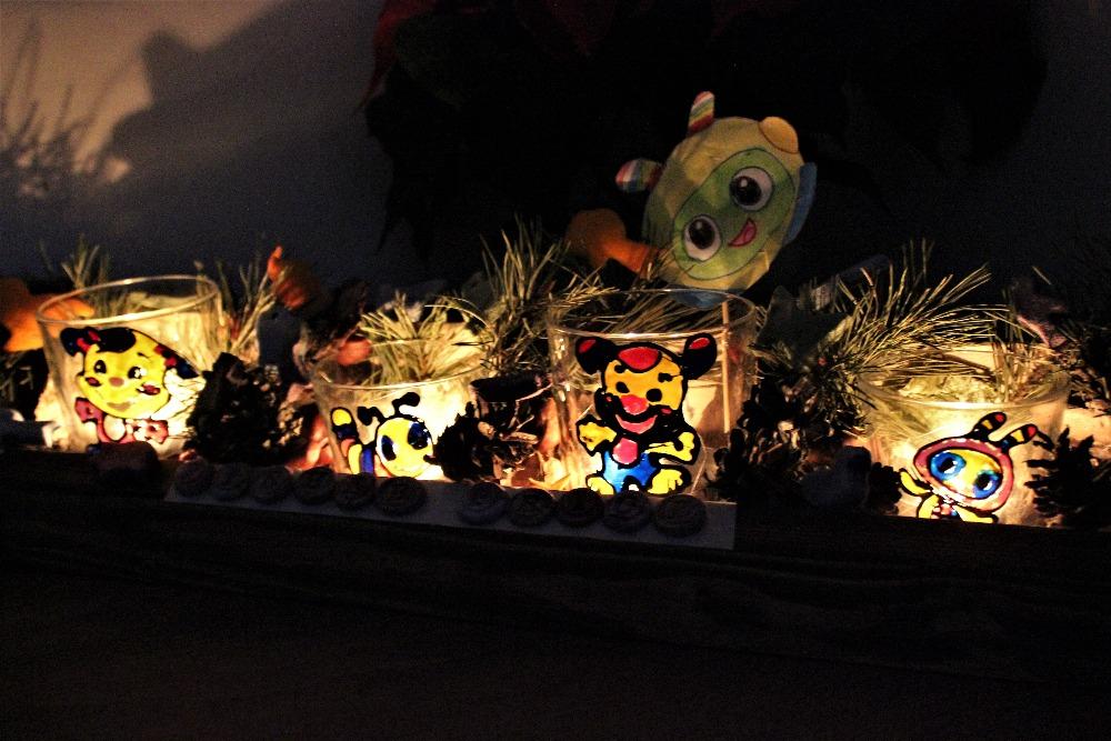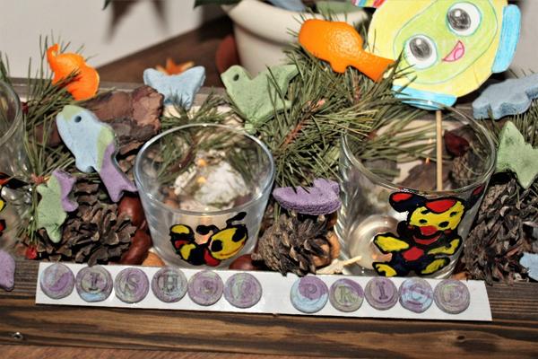 Finální výsledek - je tam použito zapichovátko z minulého týdne FP, zvířata, které si vybrala Nika - aranž už byl v mých rukou. nalepování FP postaviček sem raději udělala tak, že sem je nesloupla - jsou tam i s folii, to proto že nevím, jak dlouho mi to tady manžel strpí :D ale asi dlouho, protože náš svícen sklidil velkou pochvalu doma 🙂