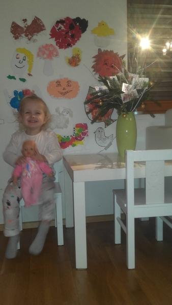 Tak teda i my přidáme svoje "košťátko" jak by řekl tatínek, ale snaha byla a při tom všem frmolu dneska (pečení cukroví, návštěva) bych řekla, že to zas taková hrůza snad není - vypadá to víc jako stromek než koště :D Každopádně malá se snažila pomáhat, co to šlo, kreslit ještě moc neumí (což já teda taky moc ne :D ), ale obrázky aspoň "vylepšovala" svým stylem... Konečný výtvor jsme se rozhodly dát na balkón - po zkušenosti s adventním věncem, který nám po 10 dnech celý popadal a zbyly z něj holé větvičky... Tak snad se jím budeme kochat na balkoně aspoň do Vánoc 😉 Přejeme pěkný zbytek dne 🙂