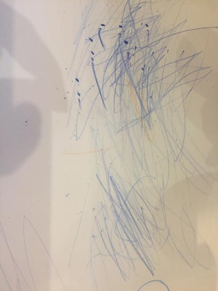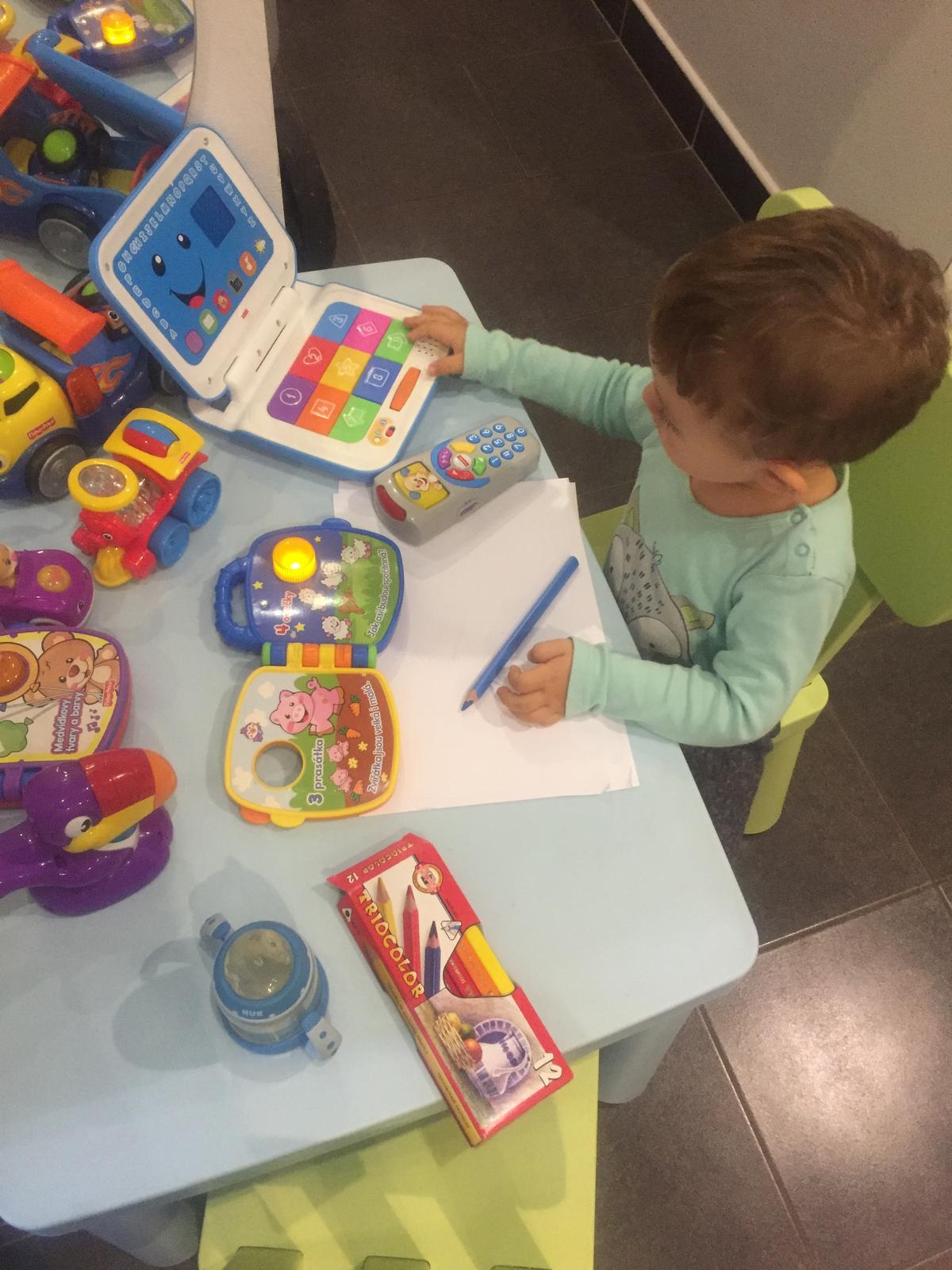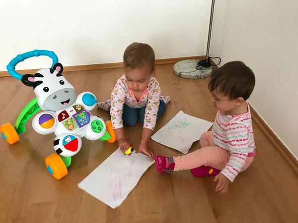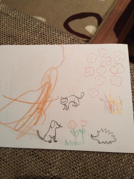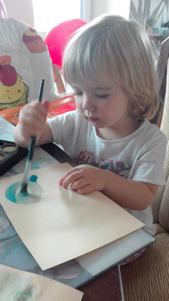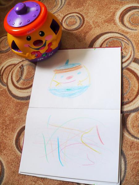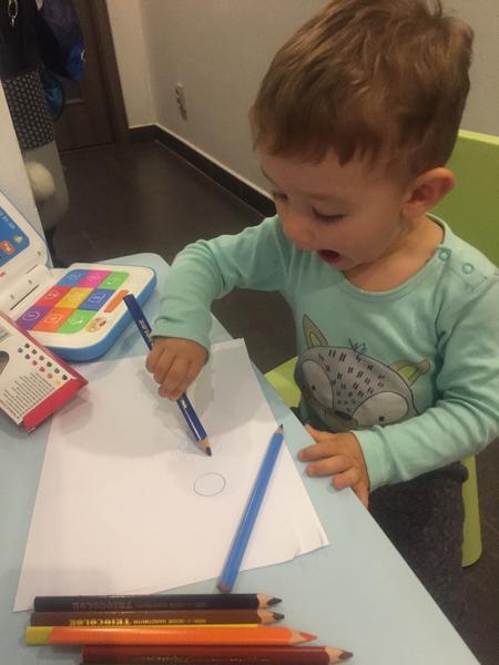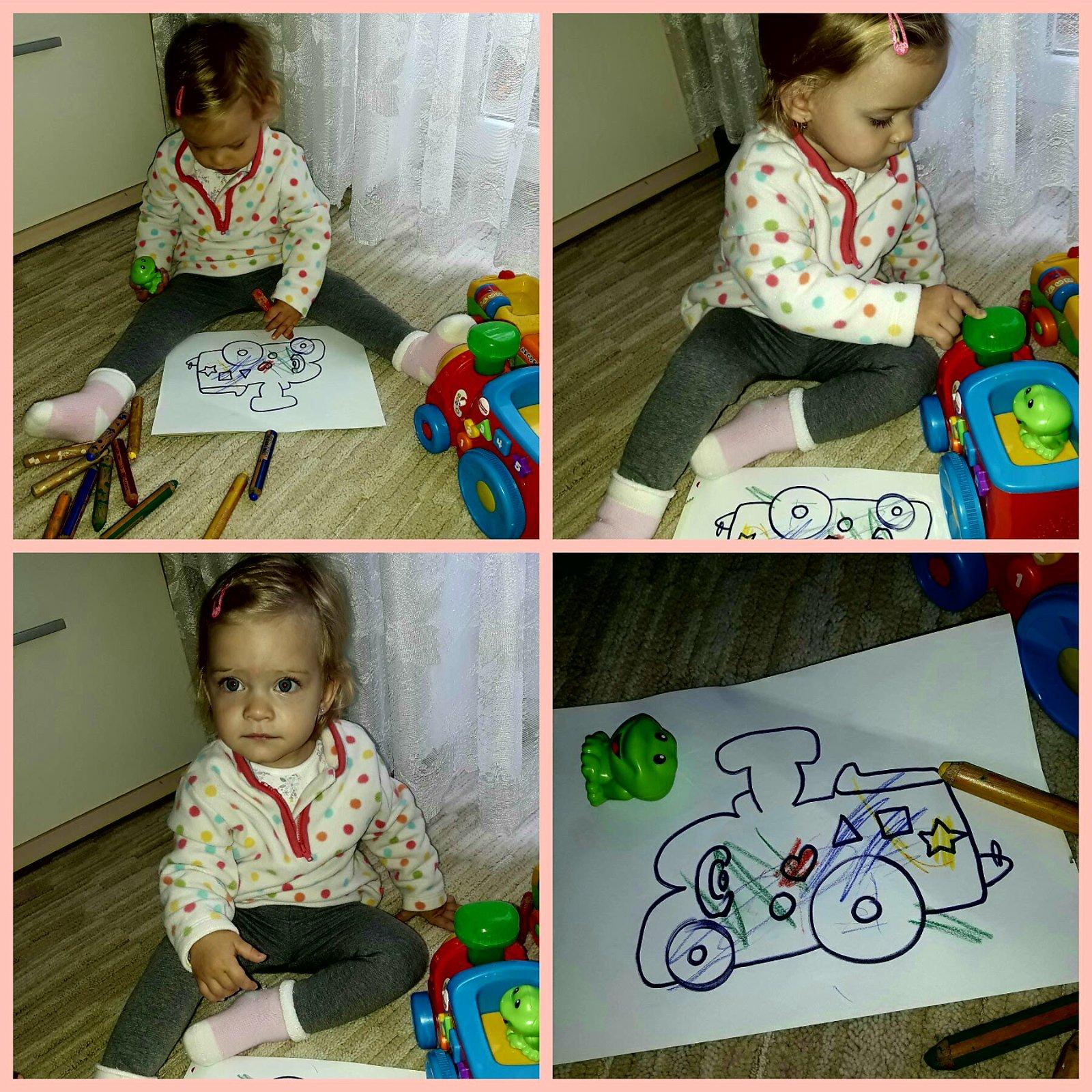 Dcera (skoro 1,5) maluje moc ráda, ale vlastně jsou jen různé čáry (ale úchop od bráchy odkoukala skvěle), takže nic🙂.