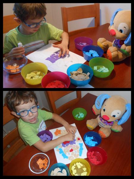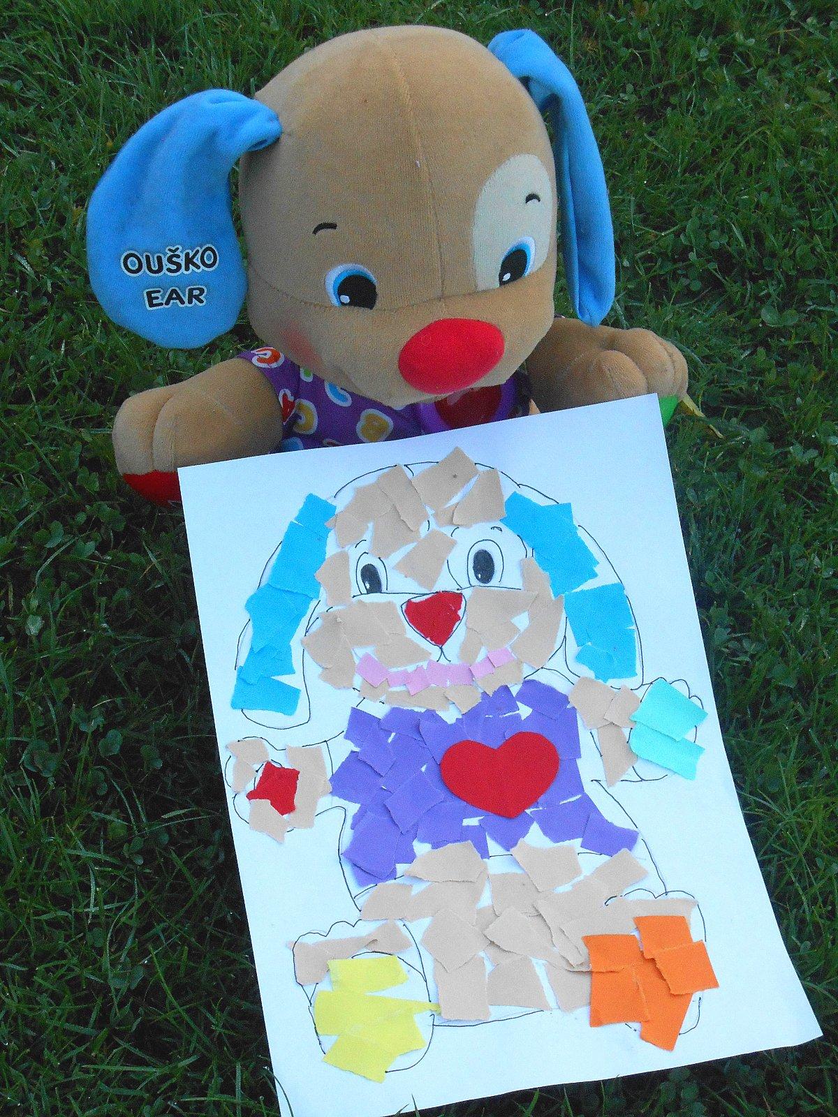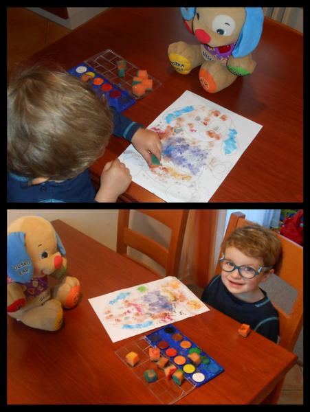 My jsme tvořili kamaráda PEJSKA🐶. Nakreslila jsem obrys pejska... Starší Samík (4 roky) trhal barevné papíry na kousky, třídil do mističek podle barev a pak lepil na správné místo (cvičil barvičky, orientaci v prostoru - levá, pravá strana. Mladší Honzík (2 roky) měl nachystané vodové barvy a houbičku nastříhanou na kousky. Namáčel houbičku do barev a "ťupkal" do pejska. Byla to veliká sranda. Během tvorby jsme museli 2 krát čistit brejličky, protože přes nános barev ani neviděl😀