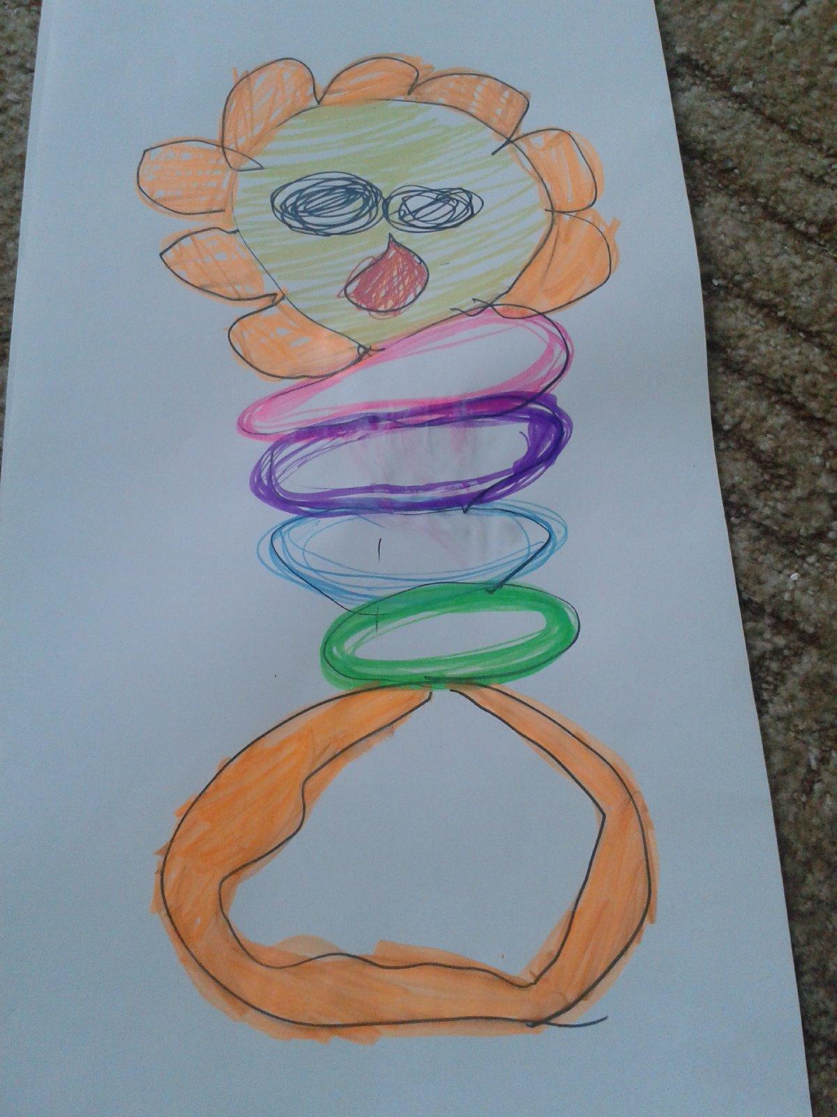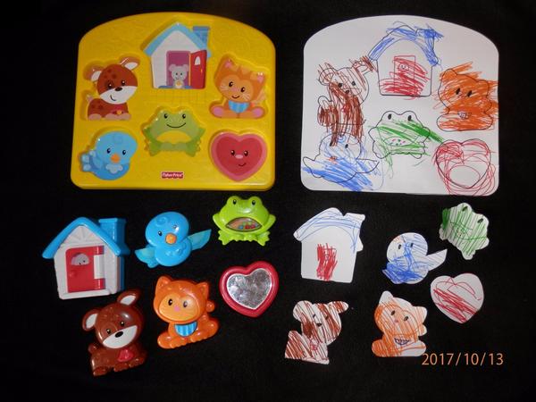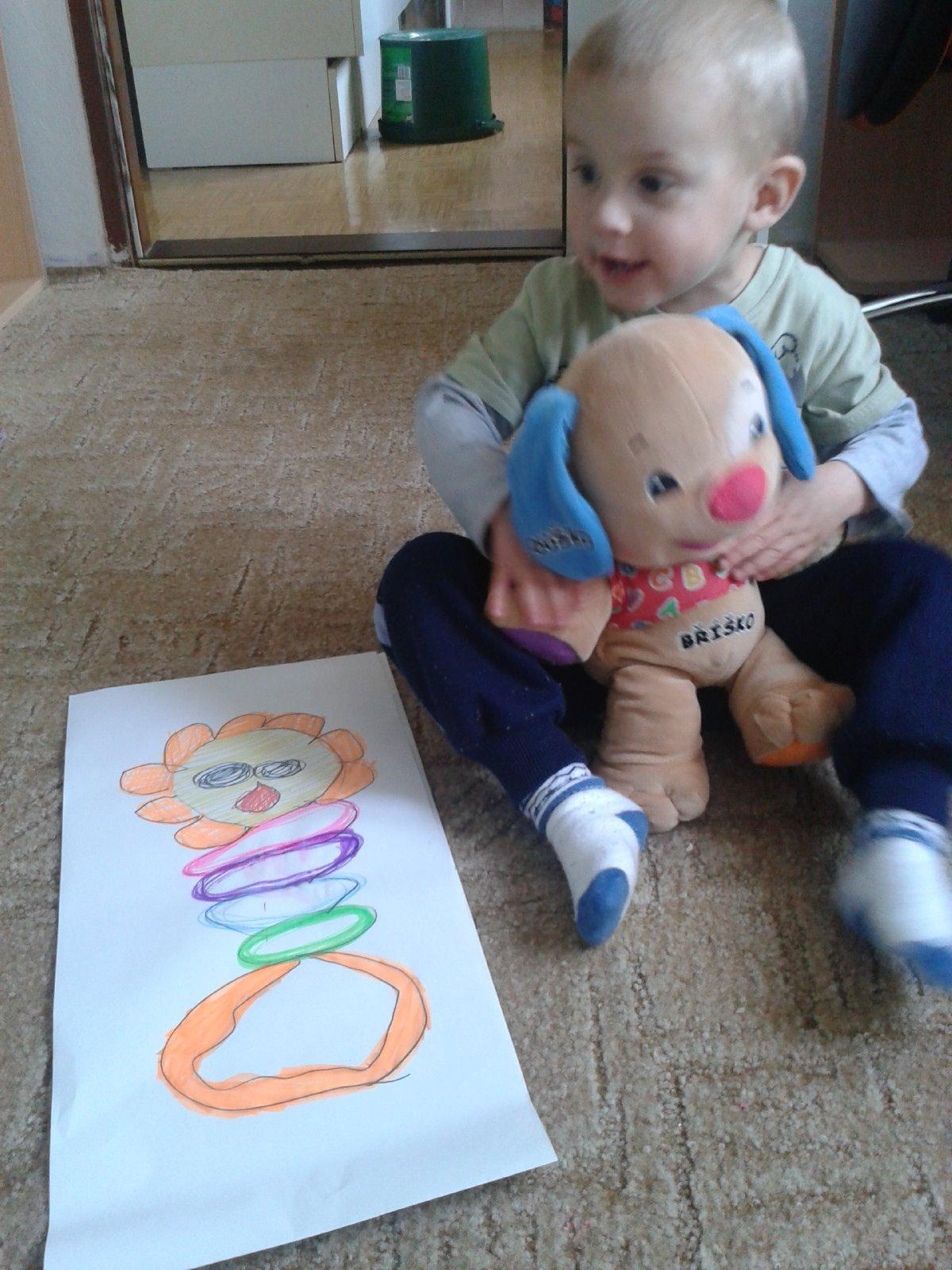 I u nás je zatím nejoblíbenější hračka pejskova sestřička, ale protože už tu je pejsků dost, rozhodly jsme se, že nakreslíme/vytvoříme dcery úplně první nejoblíbenější hračku od Fisher Price - vkládačku. Jak to dopadlo vidíte na obrázku 😀