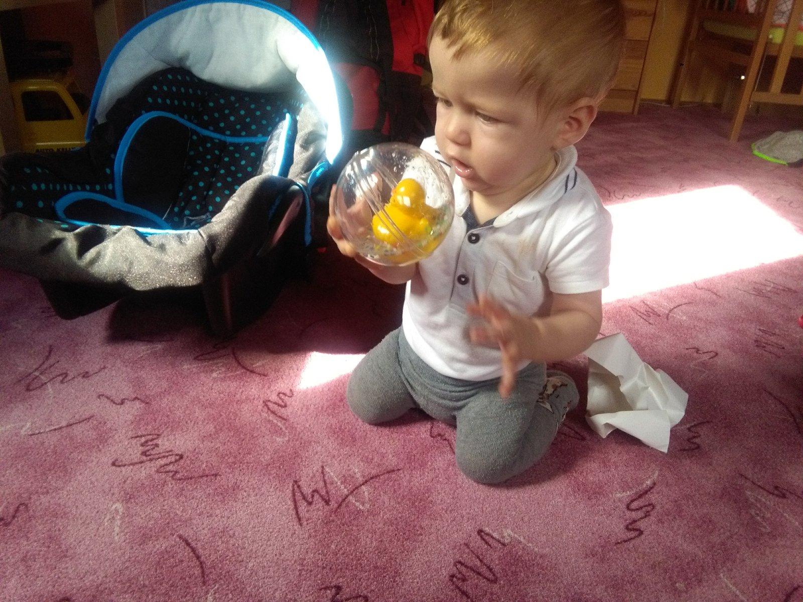 Máme moc rádi tuhle kachnu v kouli. Fascinuje jak dospěláky tak děti 🙂 pokus o nakreslení kachničky skončil ale pouze u koule zmuchlané z papíru a okousané žluté voskovky 😀