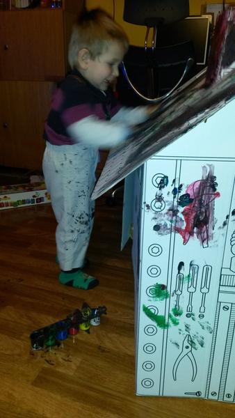 U nás se maluje všude možně, chtěla jsem vyfotit malbu deti v předsini, ale včera jim to dílo manžel znehodnotil novým nátěrem zdi..... Nejlepší vánoční dárek byly prstové barvy a papírový domeček, kde se kreslolo všechno - auta, zvířata.. jen já už nebyla tak nadšená..