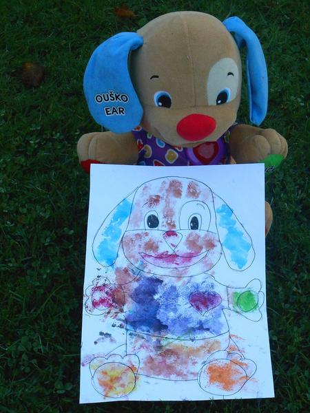 Maminka namalovala oblíbeného pejska a Sebík otiskl svou ručičku a nožičku. Ručička mu bohužel tak krásně jako nožička nevyšla, ale stejně jsem na náš první společný obrázek pyšná 🙂.