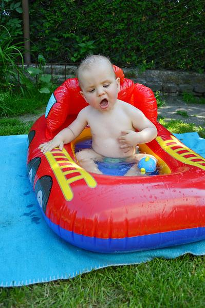 U nás se při koupání střídáme, ale přiznávám, že tatínek si to umí při koupání s mrňousem užít víc 🙂 Není problém je najít oba v jedné vaně 😀 A Maxík je maximální čochtan! Naštěstí bylo teplé léto, takže bazén byl skoro na denním pořádku. A bez hraček do vody to rozhodně nejde. Ani ve vaně, ani v bazéně 🙂 Navíc jako červencové miminko dostal k 1. narozeninám nejen nové hračky do vody a plavací kruh, ale také svůj bazének a člun do toho našeho velkého bazénu. O spokojenosti se přesvědčte sami 😀