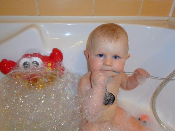 naše rybička vystřídala postupně vaničku, pak sprchový kout a nakonec vanu - z té zatím neuteče. koupe máma, poslední dobou i táta. vodu má moc rád, ale je potřeba vše v dosahu také řádně prozkoumat. nějaké hračky do vody máme, vede ale sprchová hadice a pokud se s ním táta odváží do vany (asistovat musí stejně i mamka na "lovení" z vody) tak tátův sprcháč, holt vůně dělá muže 🙂