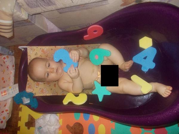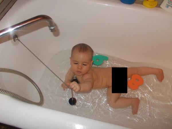 a tady dvě fotky naší malé vodnice na první ještě v miminkovské vaničce, na druhé u se rochní v naší dospělácké, zrovna se jí podařilo vytáhnout špunt