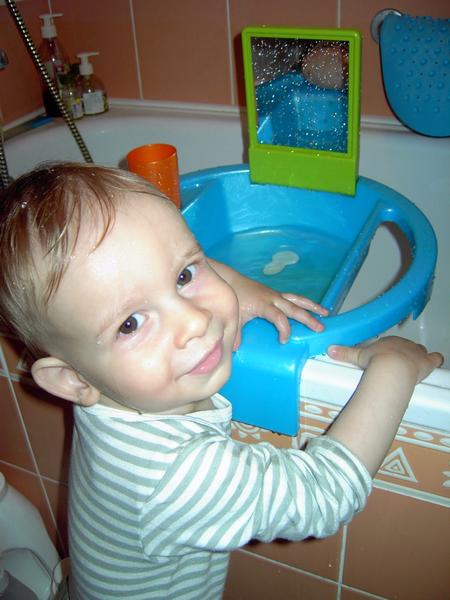 Honzík by ve vaně nejraději i spal...zrovna dneska jsem ve vaně našla peřinku, co si tam někdy během dne potají odnesl z postýlky🙂. Ale na začátku - asi první měsíc - každé koupání probrečel. Docela trvalo než jsem zjistila jakou teplotu vody má rád a musel do vaničky jen zabalený v plínce. Pak si konečně začal vodu užívat a jak jsem už posílala fotku do soutěže o plyšové sloníky - vodu prostě miluje🙂. Na stěnách i na vaně jsou všude vodolepky, některé plavou i po hladině spolu s balónky, gumovými zvířátky a míčky, a do většiny se postupně zakusuje🙂 a cáká na všechny strany. Nejraději má ale plastovou konvičku na zalévání, kterou ho opakovaně musím polévat, to prostě miluje🙂. No a když není ještě čas na koupání, vystačí si s umyvadýlkem....