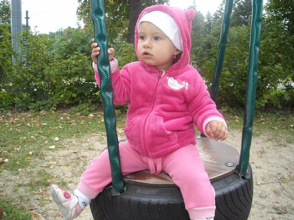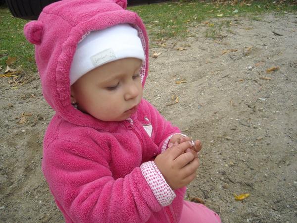 Dceru také moc baví být na hřišti, houpat se na houpačkách a hrabat se pískem a kamínky - na pískovišti si jinak zatím moc nepohraje.