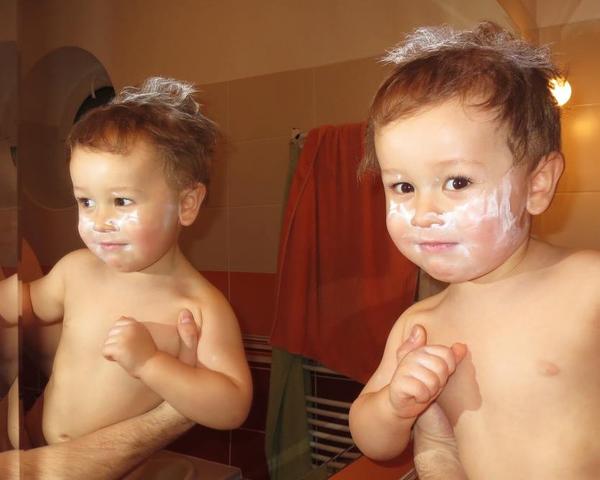 Ale, jen jednou byly ubrousky malo a asi by mi ani nestacilo to trojite baleni ubrousku. A to, kdyz jsem si tak kojila dcerku a rikala si, jak je to skvele, syn si hraje, ja si v klidu kojim a uspavam malou...a potom mi to doslo! Syn si hral az moc pekne a potichu! Dojdu do obyvaku a najdu syna s bilou rouskou na pusine, netusim co to je, kde to vzal...a az jdu bliz, tak vidim, jak drzi v ruce kelimek se vzorkem Sudocremu a to bile neni rouska, ale dokonale natreny krem 😀 😀 😀