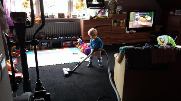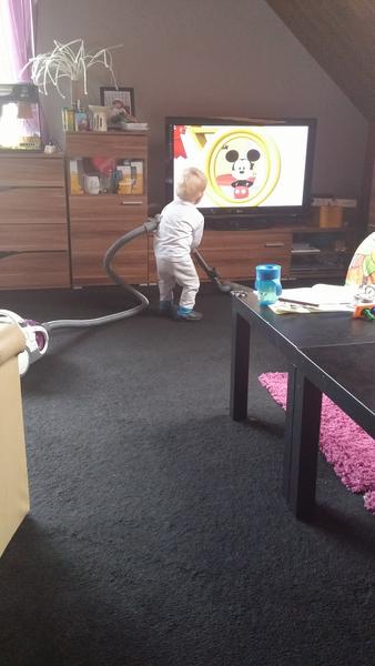 Maly ted zrovna zameta :D Pry kocici chlupy. Akorát to občas vezme i s hrackami pro kocoura. A když je zameteno a vytreno, schvalne hazi obed na zem, aby musel pracovat.