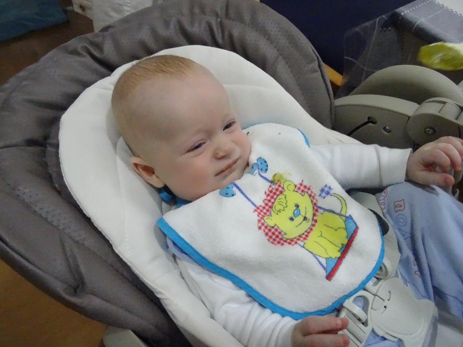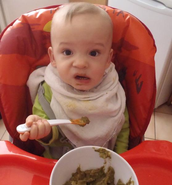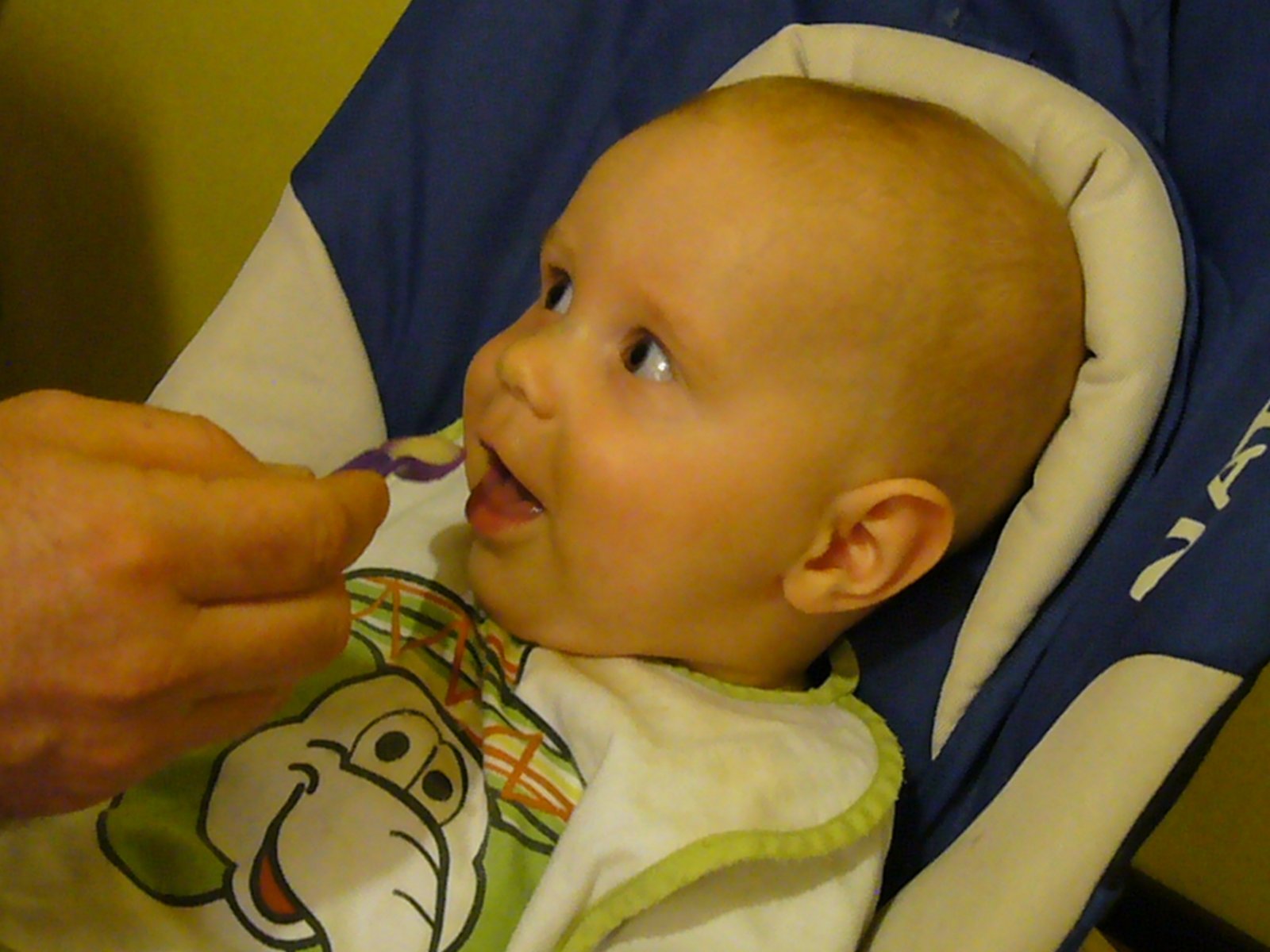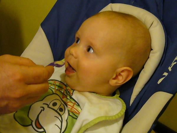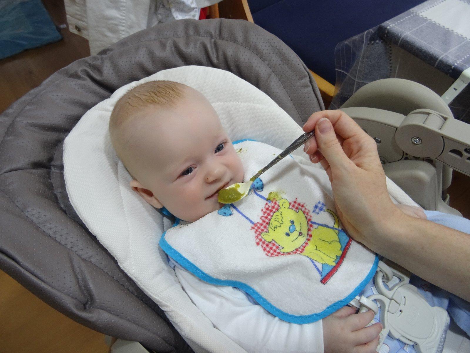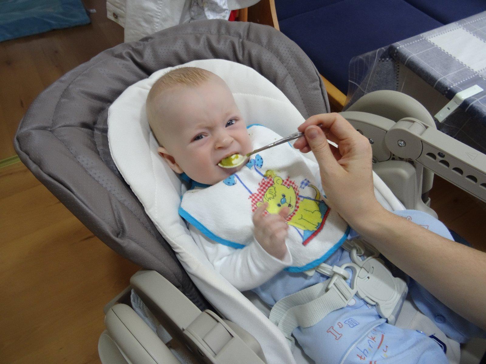 Náš Kryštůfek (4,5 měsíce) zkouší první lžičku brokolici. Ta bohužel neprošla 🙂 Až druhý den mrkvička 🙂