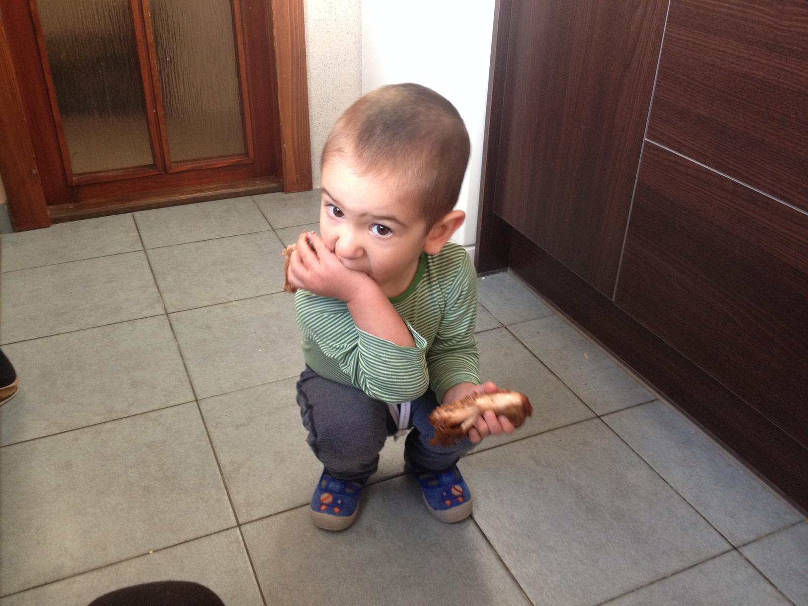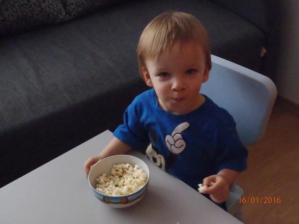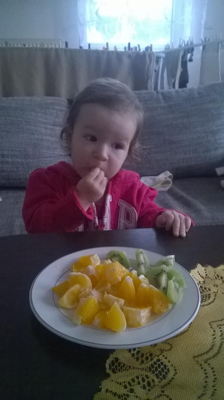 Amálka je velkej jedlík, takže na stole je pořád něco - nakrájené ovoce, namazaný chleba nebo dětské křupky. Neexistuje aby nekdo jedl bez její asistence... nejvíc má ráda bílý jogurt, těstoviny na všechny způsoby a borůvky, když má zrovna den kdy nechce moc jist suché těstoviny sní vždycky. A jako správná zenska si nezapomíná hlídat váhu 😀