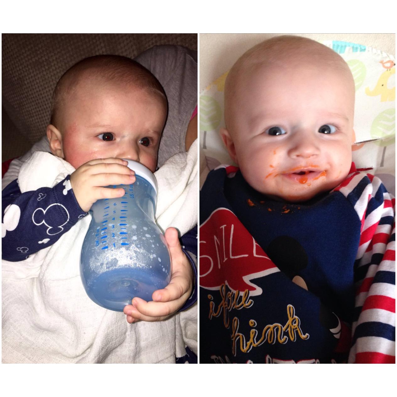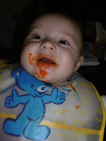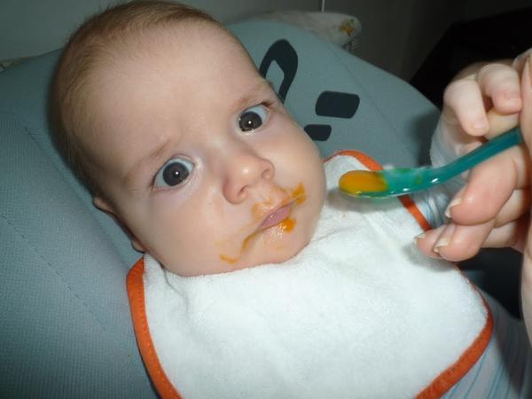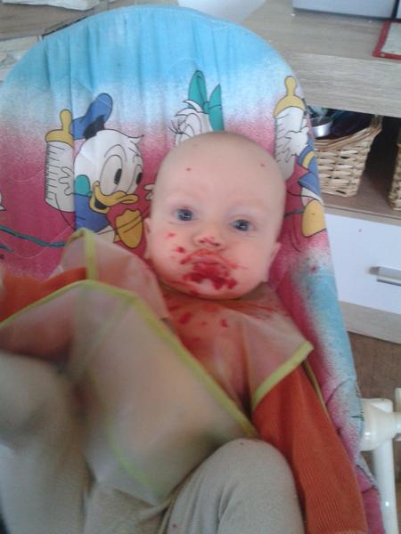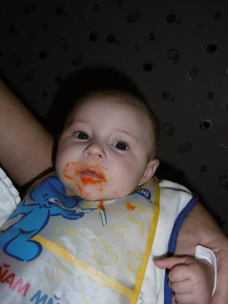 Tak u nás se papá teprve 14 dní,takže tady je první ochutnávka dýně..výraz mluví za vše. Takže Davídkovi nejvíc chutná jen mlíčko od maminky 😀