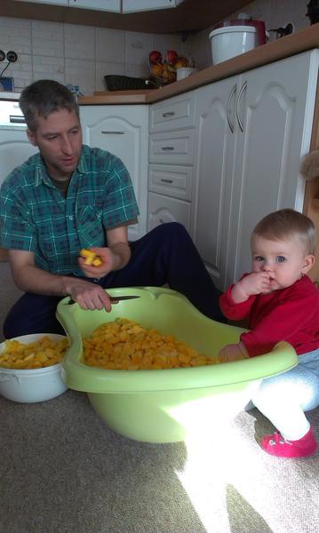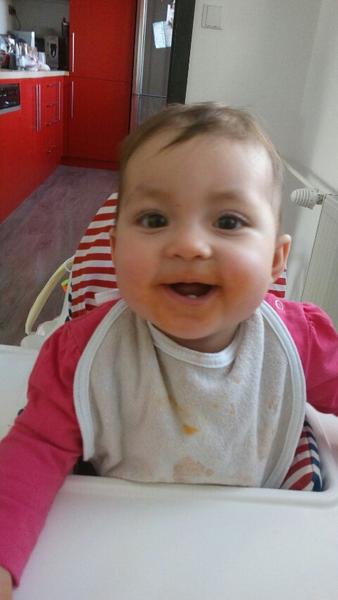 Máme doma opravdu jedlíka. Jediné slovo co v roce nádherně umí je "ham". Ochutná ráda úplně všechno co jí dáme(a někdy i nedáme-viz foto-příprava na zavařování dýně🙂). Protože má alergii na kravské mléko, jsme moc vděční za bezmléčné kaše Hipp.