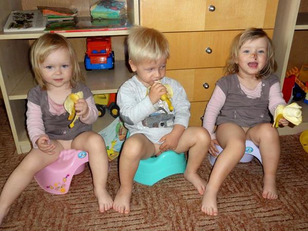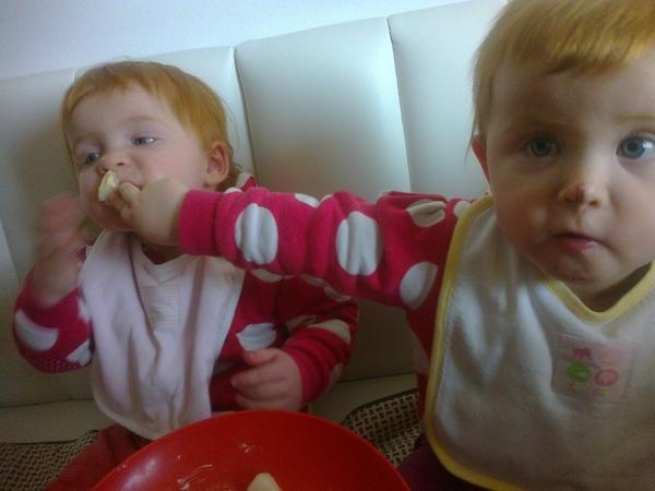 Ovoce byla a je prostě největší mňamka do teď ač jsou dnes trojčátka už pětiletá. Tuhle fotku mám moc ráda. ..když je příjem musí být i výdej 🙂