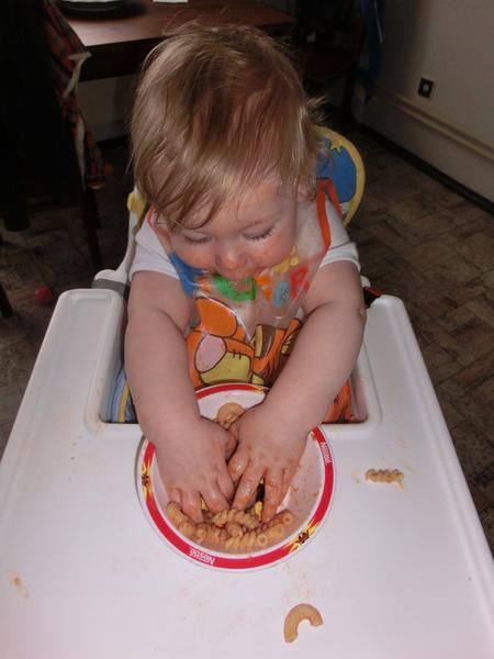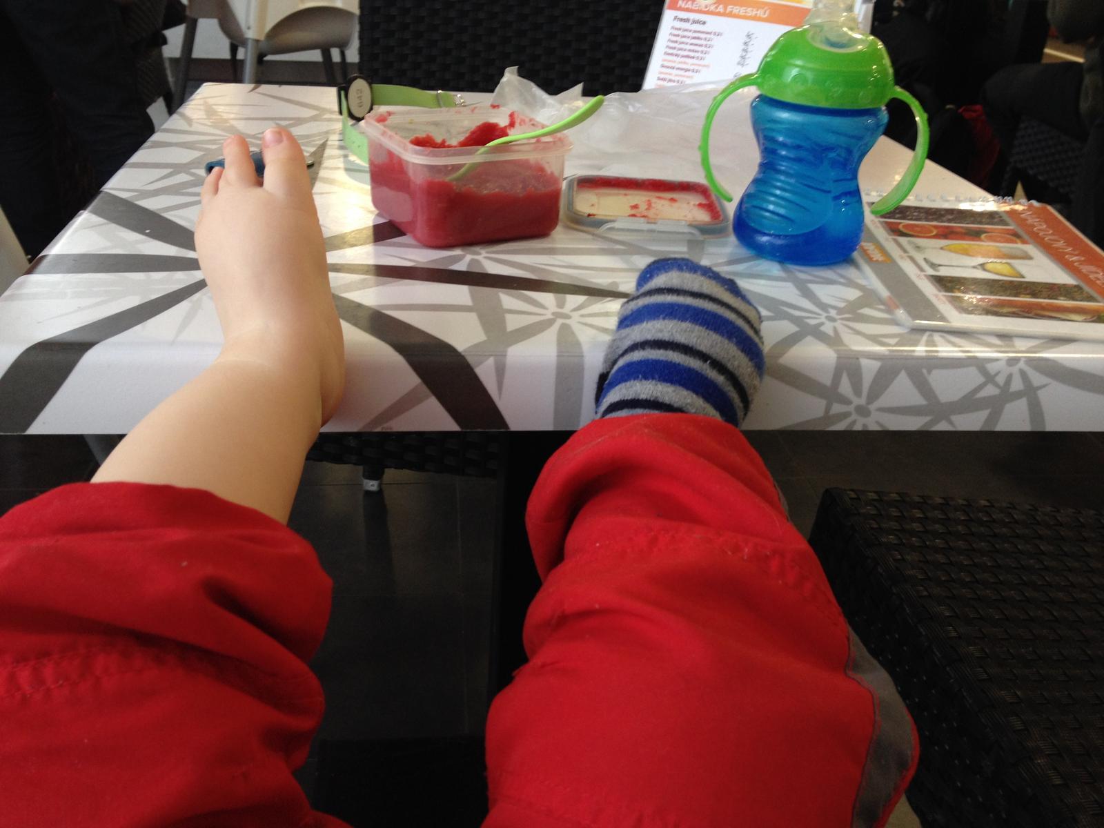Fotka dítka s jídlem? U nás nemožné, bo on (jednoroční kluk), proste u jídla odmítá sedět, takže mi třeba sedí na stole a hraje si, na klíně, nebo jsme u hraček a já mam plné ruce toho mu podávat hračky a jídlo,ze foceni proste nejde... Ale jedna ukázková jeho jezeni- leží na me a nohy ma na stole, ponožka je někde odhozena 🙂