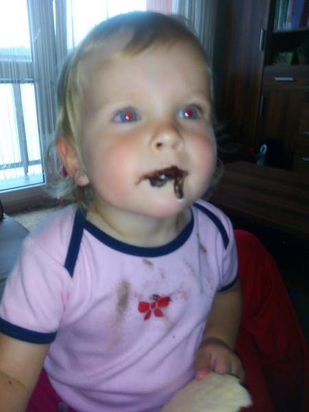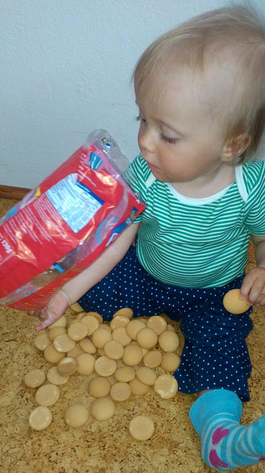 Na den jejích 1.narozenin dostala slavnostně perníček( nevím jestli můžu jmenovat značku) a radost byla obrovská. Jen maminka už tak nadšená nebyla, když po ní musela uklízet drobky pomalu i ve vedlejší místnosti 🙂
