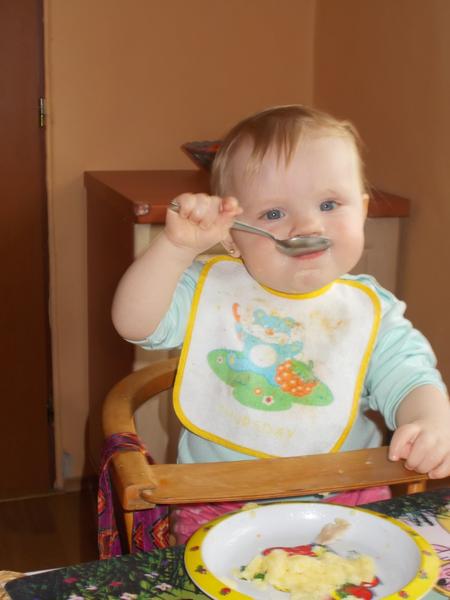 dejte mi talíř, do ruky lžičku v momentě v bříšku mém bude všecko ....máme takovou malou "otesánku" ..nejlepší je ovšem to co má na talíři nebo v ruce někdo druhý ...o to větší zklamání nastává,když zjistí,že ona mělo to samé 😀..zájem o jídlo dokazuje hlasitým "mňam, mňam" a snahou vyšphat se do židličky...jinak novinkou je každou lžičku pofoukat kdyby byla horká ..to nevadí, že na ní je jogurt