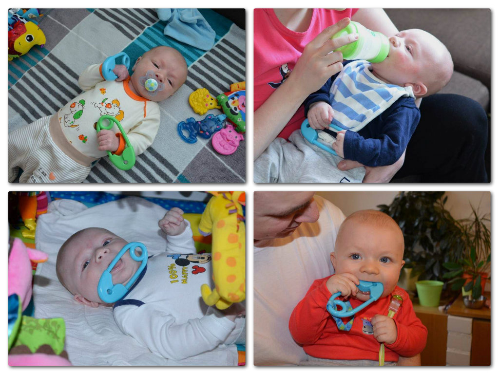 U nás vedou špedlíky na plné čáře už od narození. 😵 Máme pro jistotu dva - zelený a modrý, kdyby se náhodou jeden zatoulal. Špendlík nedá Lukášek z ruky... Na návštěvě, při přebalování, v kočárku a dokonce (jak je vidět na fotce vpravo nahoře) ani při jídle. 😀 😀