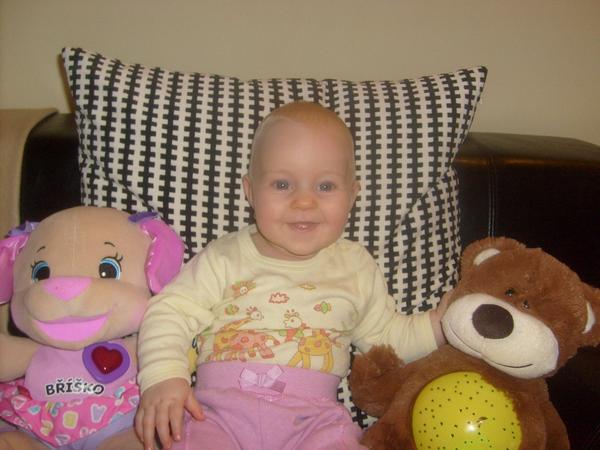 Naše Dorka si už ve 2 měsích oblíbila "Slintáka" jak mu s úsměvem doma říkáme... pro ní je to Medvěda 🙂 Spí s ním, jím s ním, chodí s ním ven, sedí s ní na houpačce i v autosedačce... dokonce i když ležela v nemocnici, tak jediné, co chytla do ručičky byl taky méďa Slinták...Velkou výhodou naší oblíbené hračky je, že může mít nespočtné množství náhradníků - je to totiž sériový medvídek IKEA 😀 , a tak, když se nám (ještě jako nezkušeným rodičům) stalo, že jediný medvěd, který u nás původně bydlel zmizel (nejspíš se zaběhl při procházce v lese). museli jsme vyhlásit akci - Návrat Slintáka - protože naše Dorka nespala, jen řvala...zoufalá jsem na Facebook napsala, že sháním někoho, kdo by nám přivezl náhradníka a protože všichni naši kamarádi vědí, jak životně důležitý Slinták je 😉 , přihlásili se během 10 ti minut! hned 4 zachránci, kteří nezávisle na sobě dodali medvědy náhradníky...první z nich k nám dorazil už týž den po obědě, další 4 v průběhu víkendu 😀 )nutno podotknout, že nejbližší IKEA je skoro 90 km a medvědi přijeli z Prahy i z Brna 😀 Dorinka to náležitě ocenila, od té doby mazlí Slintáky vždy alespoň 2 najednou a miluje je všechny stejně...už jí budou 2 roky a pořád se bez nich nehne ani krok...