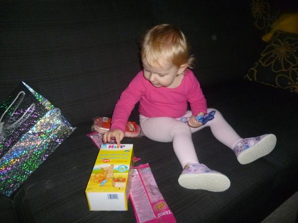 Co se týče sladkostí, dostává různé sušenky (od Nestlé a od Hipp - od mala miluje ty rýžové) - nesní jich moc, takže ji v nich neomezuji, má k nim téměř denně přístup a ne vždy si nějakou dá. Když o víkendu hlídala dcerku babička a vzala ji na procházku a dcerka začla strašně vyvádět před DM drogerií a křičela mňam mňam mňam a prosila, tak mojí mamce došlo, že tam je něco dobrého. Dcera bezpečně našla ovocné tyčinky od Hipp, které jí kupuji. 🙂 Teď krátce ochutnala gumové medvídky a strašně si je zamilovala, tak občas dostane nějakého medvídka. Jiné sladkosti nedostává (občas kousek domácí buchty), ale miluje ovoce, tak toho sní denně hromady.