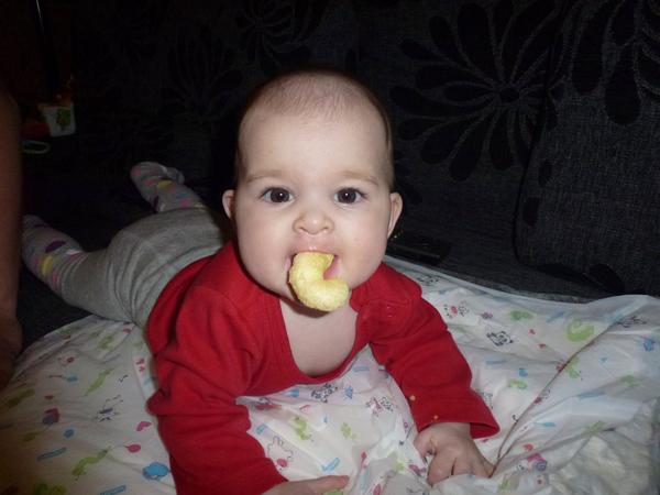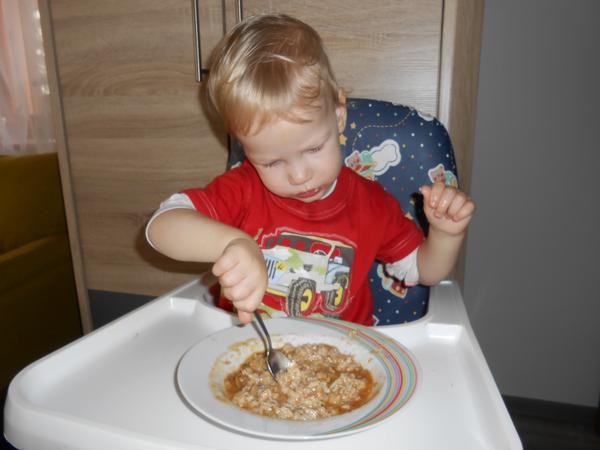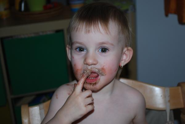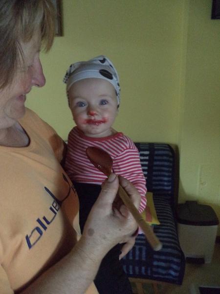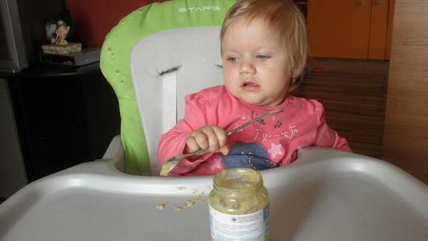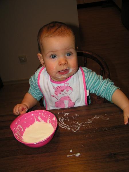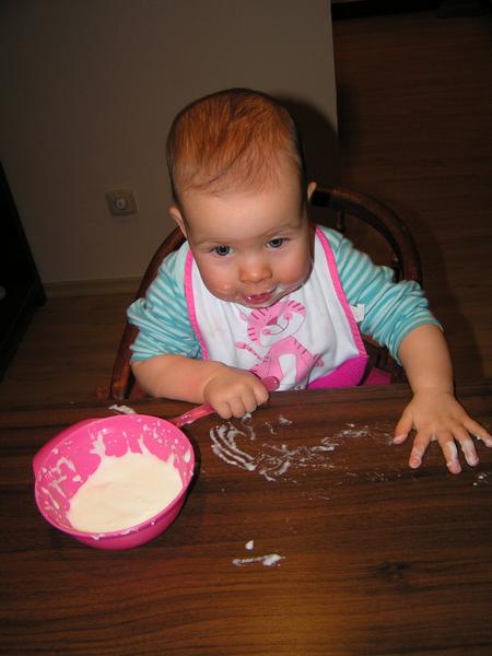 Maruška (10 měsíců) právě hamala u babičky (v židličce ještě po mamince i babičce) Obilnou rýžovou kašičku Hipp. Nejdřív jsem ji krmila, ale pak chtěla hamat sama. No tak jsem ji nechala. Po chvíli hamání zjistila, že kaše je nejen dobré hamání, ale dá se s ní i hezky "malovat" po stole a mističku odsunula stranou. Tady je výsledek. To nešlo nezdokumentovat. Ještě jsem chtěla přidat samotnou krabici s kaší, ale bála jsem se, že by Maruška udělala "Sněží!" a sypká kaše by byla všude. I toto stačilo 🙂 A teď jde na chvíli spinkat. Za celý den spala jen hodinu dopoledne.