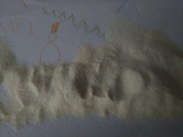 Říkám dceři, at nakreslí obrázek, kde bude třeba sněhulák a dáme na něj mouku, jako že je tam hooodně sněhu... dcera mi vzala krabici s moukou a udělala toto, prý má být tolik sněhu, aby nebyl vidět ani sněhulák... no, něco v tomto smyslu je na obrázku, to vzadu je prý maminka.... ale dodala, že sníh má být modrý a zelený... 😀