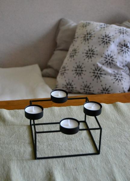 Musím říct, že co se týká věnce - jsem pragmatik 😉 V minulých letech zdobil naši domácnost během adventu můj "ubrouskový" DIY svícen (1. foto) a letos jsem "výrobu" adventního "věnce" vzala ještě víc hopem (foto č. 2) - ale polštářky za ním a bílý přehoz mám z KIKU 😀