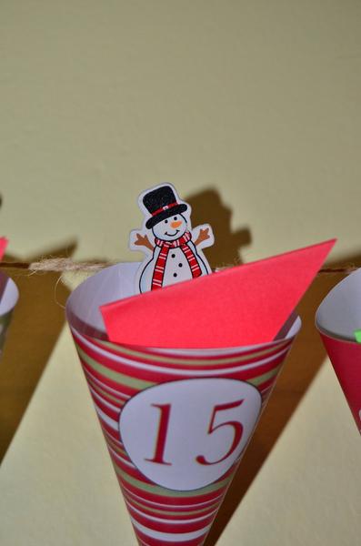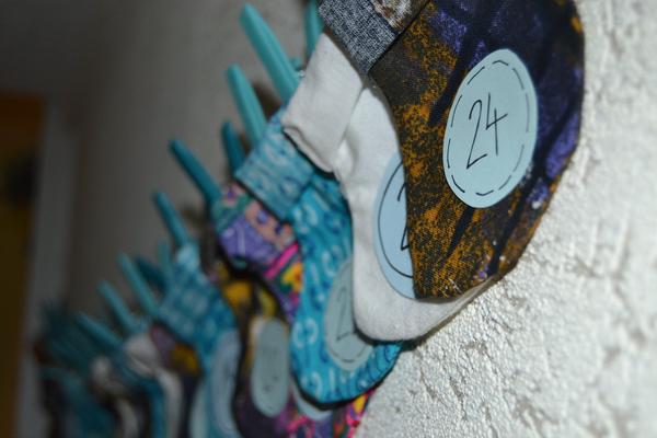 S výrobou adventního kalendáře jsem začala loni, kdy měl syn teprve rok a půl a žádné sladkosti moc nejedl, tak jsem mu do papírových pytlíčků dávala kostky z lega 😉 Z jeho kalendáře jsem tenkrát měla největší radost já, jsem na něj pyšná ještě teď, když si prohlížím fokty 😀 Letos jsem "recyklovala" punčošky, které pro mě a bráchu šila moje maminka, když jsme byli malí. Na každou jsem nalepila číslo a kolíčkem je připevnila na provázek.
