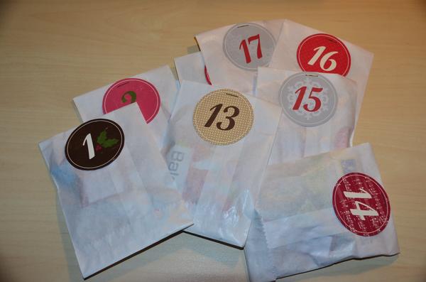 Já jsem v loni manželově dceři vyráběla takovýto kalendář. Do košíčku jsem zabalila různé cukrovinky některé do pytlíčků, jiné do alobalu anebo balícího papírů. Na 24. prosince jsem jí zabalila největší dáreček, baňku ptáčka na stromeček.