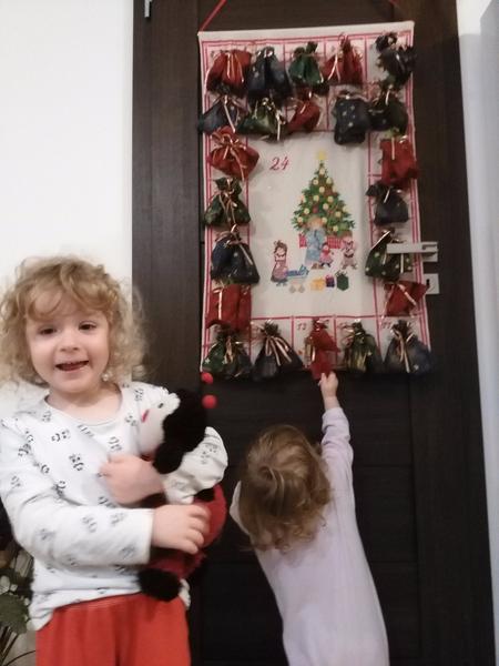 Máme domácí kalendář 🙂 Mám vyšité pytlíčky s číslama, do nich vždy přijde nějaký drobný pamlsek a pak je rozmisťuju všude možně po bytě. Když se převážou hezkou mašlí, tak je to zároveň i milá předvánoční dekorace 🙂
