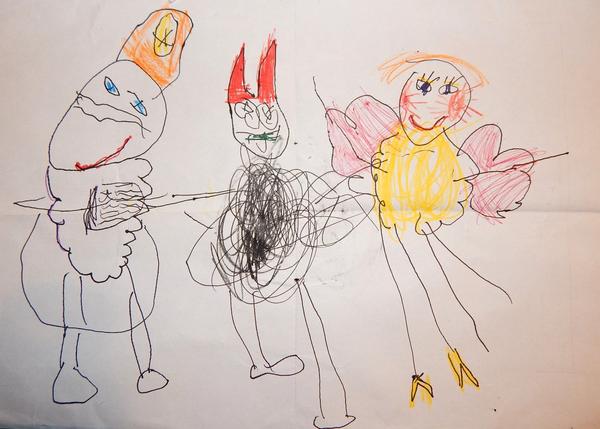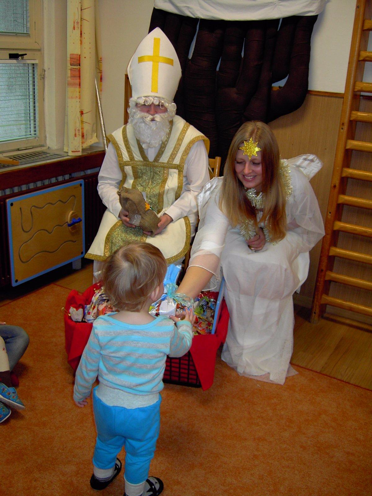 3/ Anebo nám můžete vy či vaše dítko něco pěkného, nejlépe mikulášského, namalovat či vyrobit - bylo by to něco mooooooc abstraktního, a že je to něco na téma Mikuláše, bych tvrdila asi jen já, takže ani tady nemám, co nabídnout☹, takže můžu jen přiložit fotku z 1. Mikulášské besídky, kde si ho zavolal Anděl a dárek mu musel předávat natřikrát, protože chudák nevěděl, proč by si měl něco brát 😀