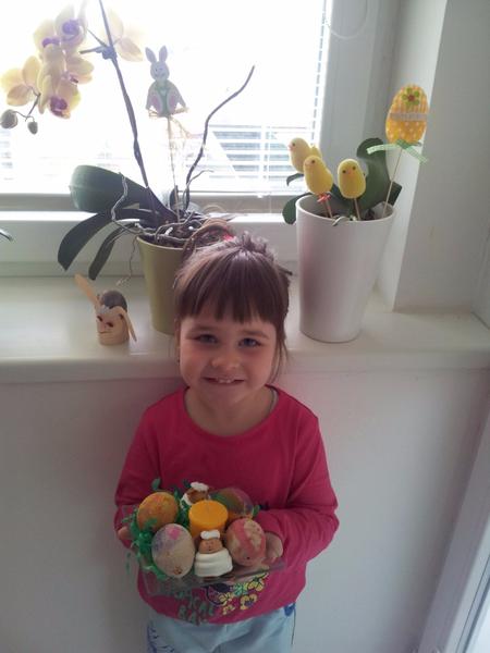 Amálka drží svícínek vyrobený z vajíček a figurek, které tvořila v dílničkách spolu s maminkou. Není nad to při dvou dětech si udělat čas na starší dítě 🙂 Krásné a požehnané Velikonoce všem!