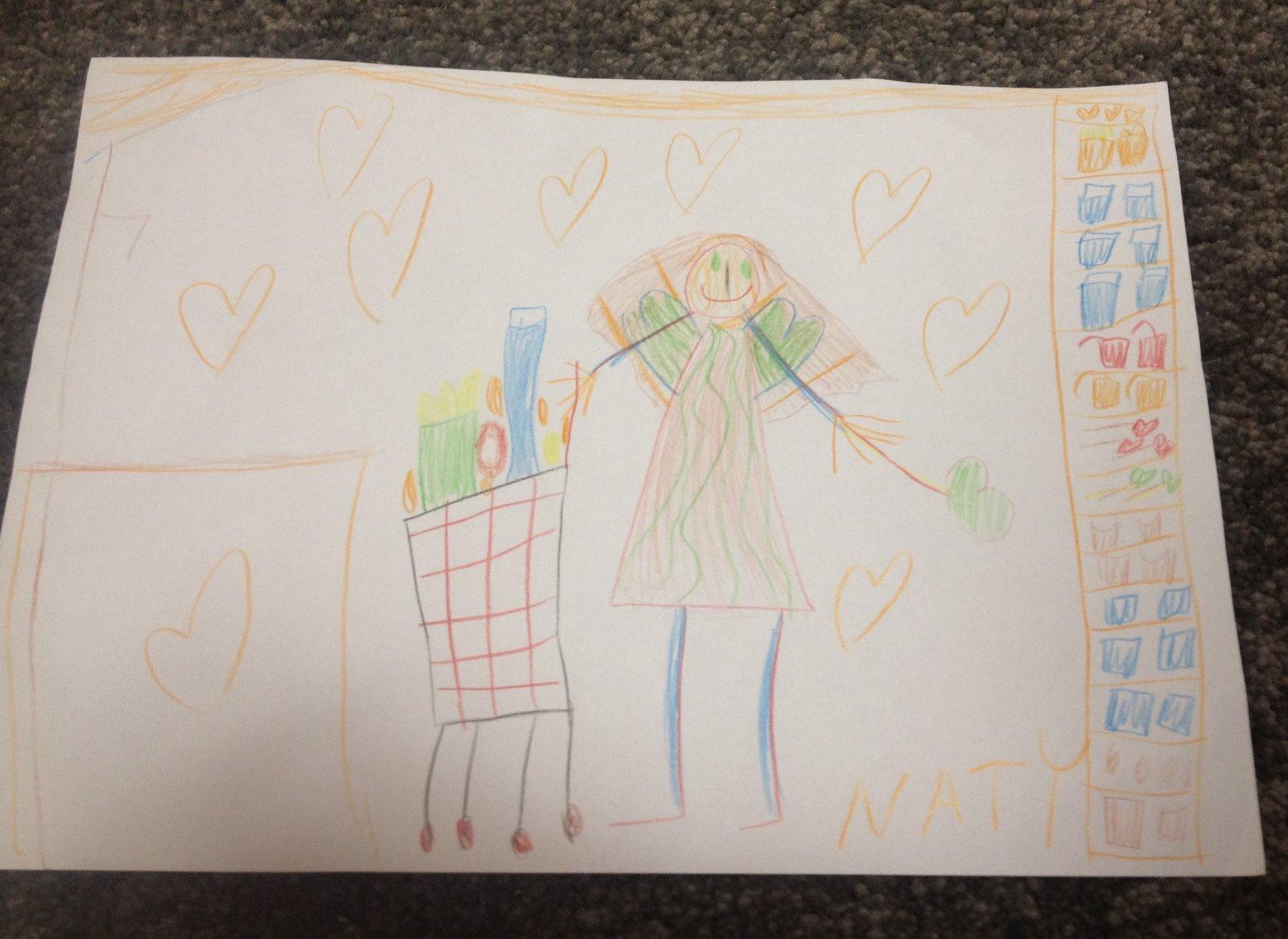 Jelikož je ve školce, a kromě podpisu NATY zatím nic jiného psát neumí, tak za ni její představu tlumočím. Maskota si vysvětlila jako nějakou pohádkovou postavu - v tomto případě vílu s křídly, která nakoupí do košíku, a přenese "vílí cestou, tedy vzduchem" nákup rovnou do domečků lidí, který si nákup objednali.