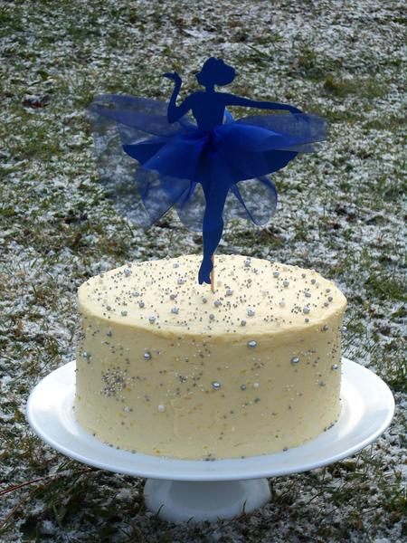 Do středu dortu zapíchneme tanečnici - sněhovou vločku (z tvrdého papíru vystřihnout siluetu tanečnice a z pruhu organzy ušít sukni.